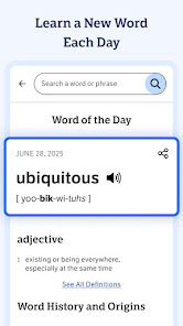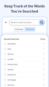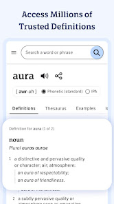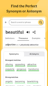 With more than 2 million trusted definitions and synonyms, this English dictionary and thesaurus app for Android is optimized for your mobile device. Improve your English vocabulary, whether you're just starting your learning journey or you're already a word wizard. Install the app for access to definitions and synonyms whenever and wherever you need them â no bulky books necessary. Flip to dark mode to give your eyes a break, or stick to the traditional set-up.