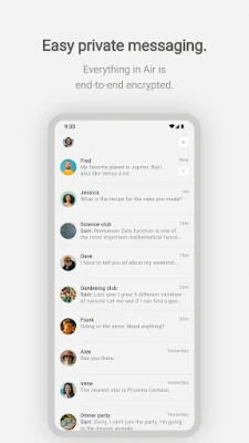 • Create groups to chat with different circles of friends. • Your privacy comes first. We don’t collect any sensitive information like your phone number or email address. Because of our MLS protocol, we can’t read your messages or find out who your contacts are, and neither can anyone else. • Unlike traditional messaging apps that were primarily designed for one-to-one communication and later adapted for groups, Air leverages MLS's native group messaging capabilities to offer robust security guarantees, including protection against eavesdropping, tampering, and message forgery, while maintaining both Forward Secrecy and Post-Compromise Security. • Everything in Air is free. Air is created by a social impact tech company called Phoenix R&D, making messaging more secure and private for everyone. We’re not supported by advertisers or investors, and you can see our funders on our website at https://phnx.im.