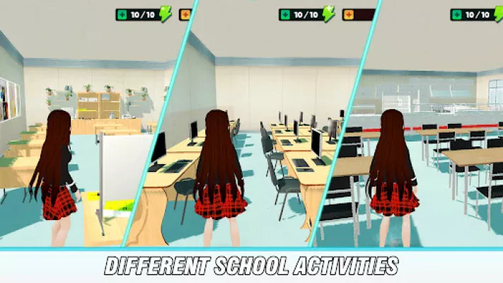 Live the school experience the way you like it best: participate in gym activities, take exams to gain experience and other rewards, eat at the school lunch, roam freely around the classes and much more. Play just like in a real life anime school simulator and explore freely a big high school at your own pace!