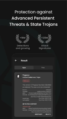 Over 8,000,000 users worldwide trust Protectstar apps. Our Antivirus is designed for users who value advanced security. For this, our virus scanner is certified by leading independent institutes such as AV-TEST and Testing Ground Labs in 2023 and 2024. Our virus scanner & antispy mobile app sets new standards and outperforms even renowned antivirus mobile apps with an exceptional detection rate of 99.96%.
