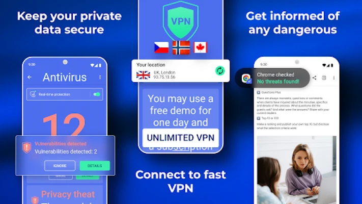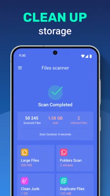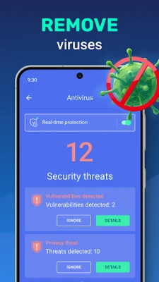 Device protection against hacker attacks. The antivirus will scan, detect and delete viruses on your device. Device protection against all potential threats: viruses, trojans, malware, spyware, and adware.