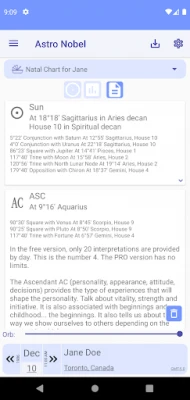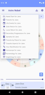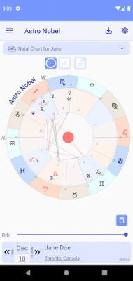 With Astro Nobel you can access all your birth charts, and also those of family and friends. Includes Natal Chart, Transits, Solar and Lunar Return, Secondary Progressions and Synastries; You can also add the chart of any person's life event and access the transit dates of any planet in your natal chart.