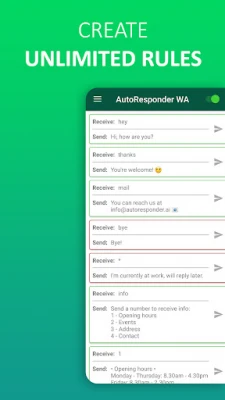 Automatically respond to custom received WhatsApp or WA Business messages with this bot. You have a lot of settings to customize each auto reply for your needs. Download now for free!