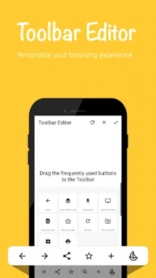 Did you feel uncomfortable because the basic UI provided by the browser? The Banana Browser provides an editing function that allows you to place frequently used functions on the bottom toolbar to suit your taste. You can freely arrange and use your favorite functions such as bookmark, go back, add tab, refresh, and dark mode and so on.