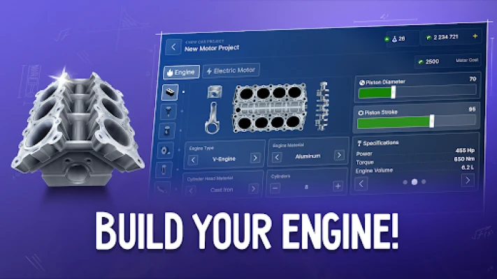 Construct a powerful V12 or an efficient 4-cylinder engine. Adjust piston diameter and stroke, experiment with turbochargers, camshafts, cooling systems, and exhausts. Choose engine materials, connecting rods, and other components. With over a hundred customization options, you can create your perfect engine!