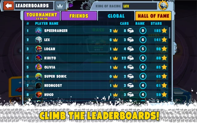 Use rubies to modify your car with some crazy upgrades (speed, turbo, control, acceleration) to ensure that you keep on ruling the track in Car Eats Car game. Pick up the look of avatars, skins, flags, disks, and turbo effects. Or buy the car from the next, more advanced league! More than 20 trucks available! Put the flag of your country or your own unique banner on them! Show everyone who's number one!