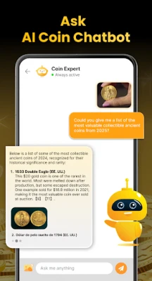 Got questions? Our AI assistant is ready to answer anything - from coins facts and historical details to value trends and identification tips, all within old coin value app.