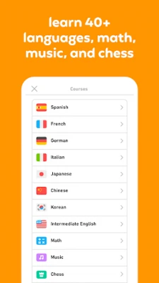 • Every language course is free. Learn Spanish, French, German, Italian, Russian, Portuguese, Turkish, Dutch, Irish, Danish, Swedish, Ukrainian, Esperanto, Polish, Greek, Hungarian, Norwegian, Hebrew, Welsh, Arabic, Latin, Hawaiian, Scottish Gaelic, Vietnamese, Korean, Japanese, English, and even High Valyrian! And now, learn Math, Music, and Chess with our newest courses!