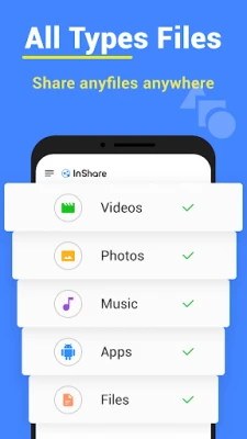 Share Apps & File Transfer - InShare satisfies all your transfer needs perfectly. With our easy share and smart transfer app, just select videos, games, photos, music, apps and pdf files you want to send, then everything will be securely shared with your friends at a lightning speed.