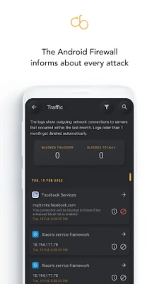 Firewall No Root uses Android’s official VpnService API to filter network traffic locally on your device. The app creates a local connection to itself, routes traffic through the firewall and then decides whether to allow or block it. Your traffic is not tunnelled to a remote VPN server and is not forwarded to third‑party servers.
