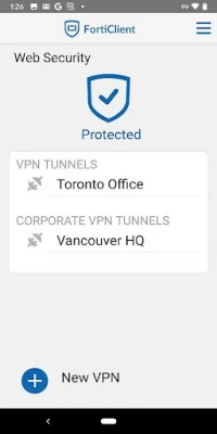 FortiClient - The Security Fabric Agent App provides endpoint security & visibility into the Fortinet fabric. It also allows you to securely connect your roaming mobile device to corporate network (over IPSEC or SSL VPN). Web Security feature helps protect your phone or tablet from malicious websites and unwanted web content. When using Virtual Private Network (VPN) connection between your Android device and FortiGate, all device traffic will be fully encrypted and sent over the secure tunnel.