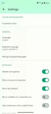 Tailor your typing experience by toggling vibrations, popups on key presses, and selecting your preferred language from the list of supported ones. Personalize your keyboard settings to suit your preferences.