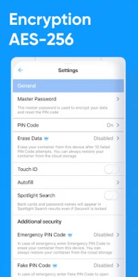• emergency pin code to delete data (if necessary, it is in the cloud storage, you can get it back).
