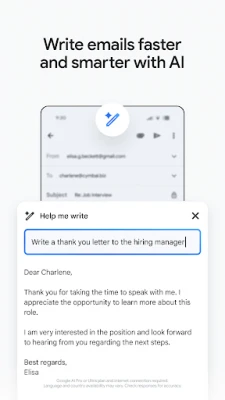 • Use Gemini* as your AI powered writing assistant right from your inbox, with built-in features like ‘Help me write’ and contextual Smart Reply