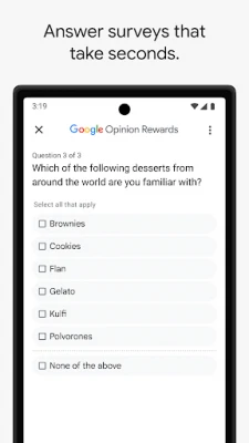Answer quick surveys and earn Google Play credit with Google Opinion Rewards, an app created by the Google Surveys team.