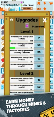 ● Spend energy points to buy global upgrades that improve all mines and farms