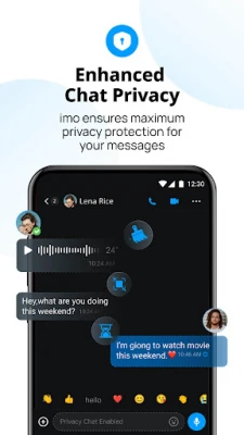 imo ensures maximum privacy protection for your message. We use Time Machine, Disappearing Message, Privacy Chat, Screen Shield and End-to-End Encryption to enhance your chat privacy. You can erase any chat message, set message timers, and block screenshot, copy, share, and download for privacy chat, ensuring privacy protection similar to that of WhatsApp and Telegram.