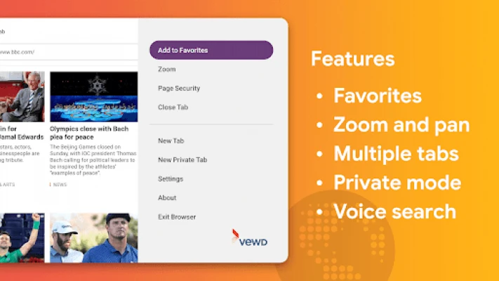 Web Browser by Vewd is carefully designed to provide an easy and intuitive browsing experience, laidback sitting in a living room, watching content on a big screen, relaxing with friends and family