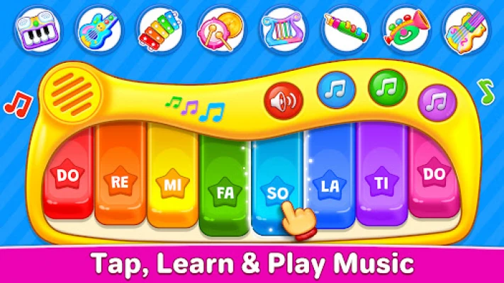 Children can tap and play authentic-sounding instruments like piano, xylophone, drums, electric guitar, flute, trumpet, and saxophone. Whether playing a simple tune or experimenting freely, the easy touch controls allow little hands to create music effortlessly. With realistic sounds, this is the perfect piano game for kids and a great way to discover music from an early age.