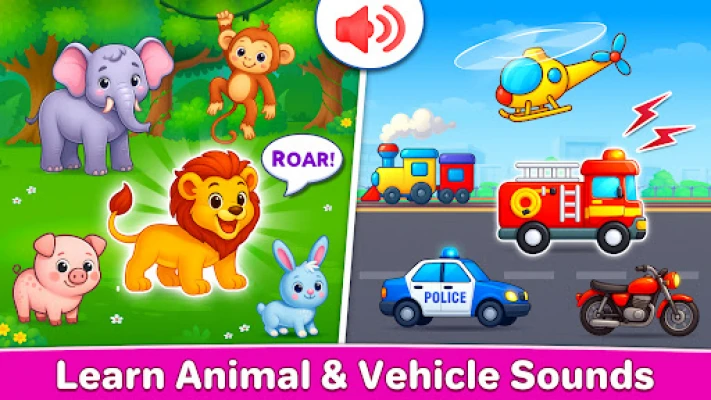 🔊 Animal & Vehicle Sounds: Discover roars, chirps, honks and more, blending music with everyday sounds children love.