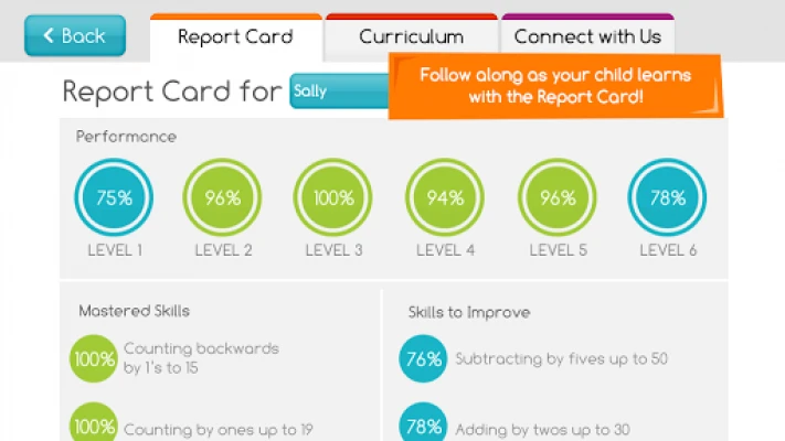 PARENT REPORTING: Includes a Report Card section where parents and teachers can monitor progress and learn about new skill-building activities.