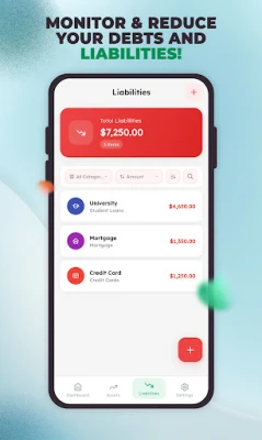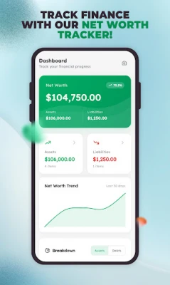 Quickly add all your assets (like savings, investments, real estate) and liabilities (like loans, credit cards). The app calculates your net worth in real-time, so you always know where you stand financially.
