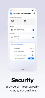 Norton Private Browser is a free feature-packed private browser with AdBlock designed to make secure browsing fast and easy to use. Developed by the cybersecurity experts at Norton, Norton’s private browser automatically blocks ads and trackers that slow you down and includes advanced security and privacy features such as anti-tracking, full data encryption, Passcode lock and unlock, and more for the best private browser experience on Android devices.
