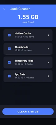 Our powerful junk cleaner helps you clean junk files safely and efficiently. As a dedicated junk file cleaner, it scans for hidden cache, temporary files, thumbnails, and residual data. Use our cache cleaner and temporary files cleaner to free up storage space with one tap.