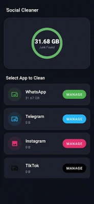 Target apps that consume the most storage. Our WhatsApp cleaner helps you clean WhatsApp storage and delete WhatsApp media safely. We also include a Telegram cleaner and Instagram cleaner to remove unused social app data.