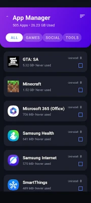 Use our smart app cleaner to manage apps efficiently. Identify heavy apps and remove unused apps or delete unused apps to reclaim storage space.