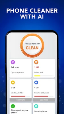 Utilize cutting-edge AI technology with our AI cleaner. This feature goes beyond basic cleaning by using advanced algorithms to detect and clean large files, duplicate photos, old screenshots, and more. The AI cleaner simplifies the cleaning process, allowing you to clean phones with just a few taps, making it an essential smart cleaner for your device.