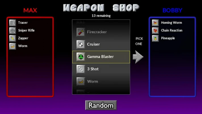 Experience the thrill of launching volley after volley of powerful and fun weapons across the battlefield, using very simple controls. Select your angle, power, and FIRE! Your arsenal of unique and useful weapons includes: Napalm, Firecracker, Skipper, Cruiser, Dirt Mover, and dozens more! This is the light-hearted game of heavy artillery for everyone.