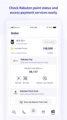 ■Wallet : Check Rakuten point status and access payment services easily