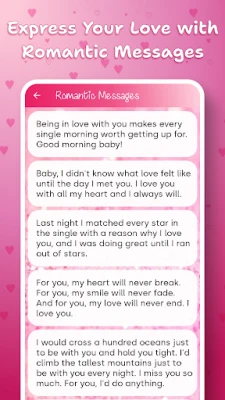 Love Messages: You may use these Romantic Love Messages: Love Letters for anything, whether when your loved one has had a bad day or if you want to remind them of how much you care. This lovely app makes sure these lovely moments are never too far away. It is not required that an event has to be associated; rather, some random romantic message may speak volumes for the amount of affection and devotion you feel towards your lover.