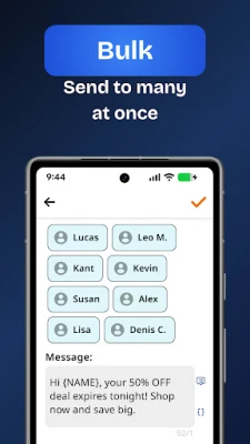 - Smart personalization: Insert contact names into your bulk messages using placeholders like {NAME}, {FIRST_NAME}, or {LAST_NAME}.