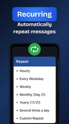 - Set recurring text messages with flexible options: hourly, daily, weekly, monthly, or define your own custom intervals.