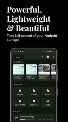Keywords: file manager, file explorer, files, storage manager, clean storage, file organizer, SD card, internal storage, material design, material you, dark theme, lightweight, fast, zip, extract, unzip, archive, photo viewer, video player, music player, audio player, pdf viewer, text editor, syntax highlighting, app manager, uninstaller, permission manager, apk, file transfer, root explorer