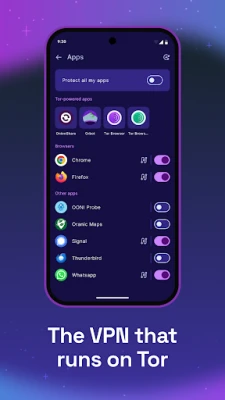 - Per-app routing: You choose which apps are routed through Tor. Each app gets its own Tor circuit and exit IP, preventing network observers from connecting all of your online activity.