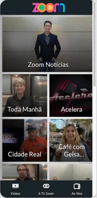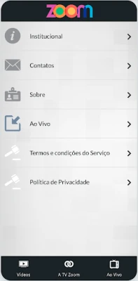 - Ao vivo: a nossa programação no ar, em tempo real, 24 horas por dia no seu celular. - Vídeos: matérias do ZoomTV Jornal e programas na íntegra. - Envie: a sua participação em foto, vídeo ou texto diretamente para a produção.