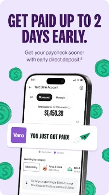 Varo isn’t just an online banking app. We are a real bank, built for the digital age. Accessible to you—with free online banking, early payday⁴, high yield savings³, credit score monitoring¹⁴, easy credit building⁷, automatic cashbackᵟ, instant cash advances (once qualified)⁵, and more. Fees apply to loans and out-of-network withdrawals/cash depositsᐞ.