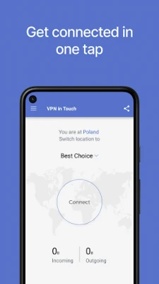 ⇨ VPN in Touch is a one-click VPN Proxy Service. VPN in Touch contains only one button. The button connects you to one of many anonymous servers at speeds faster than a web proxy. When you are not running our app we help you save your devices battery. And, we are a completely unlimited and free VPN!