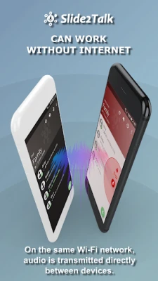 • The application works as an onlinе walkie talkie and transmits vоice messages via the cloud. However, if users are on the same Wi-Fi network, then the Slide2Talk wоrks as walkie talkie offline and sends audio directly between users' devices. It doesn't even require the Internet.