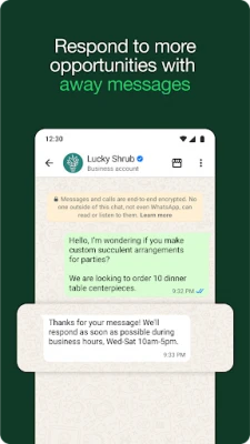 • Work smarter. Save time by letting the app do the work for you! Send customers automated quick replies and away messages so you never miss an opportunity. Use labels to quickly organize, filter, and find important conversations. Create a status to share an offer or news, and even take orders and payments** in-app to create a great customer experience.
