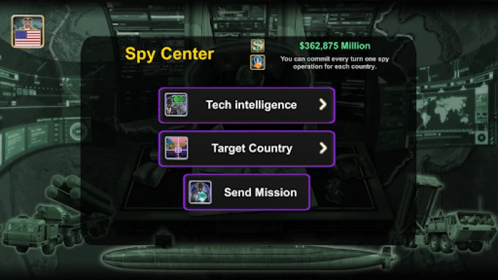 The game offers a wide range of features, including access to global Weapons Suppliers, a Spy Center, a War Room, Diplomats, the United Nations, an Economy system, Technology, and World News Distribution (Economy, Relations, Spy, and War). All this is powered by advanced Artificial Intelligence.
