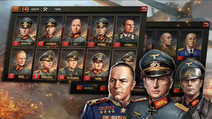 You will play the role of famous generals for various major countries, Rommel, Guderian, Manstein, Zhukov, Konev, Rokossovsky, Vatutin and other military geniuses will follow you to dominate the entire world.