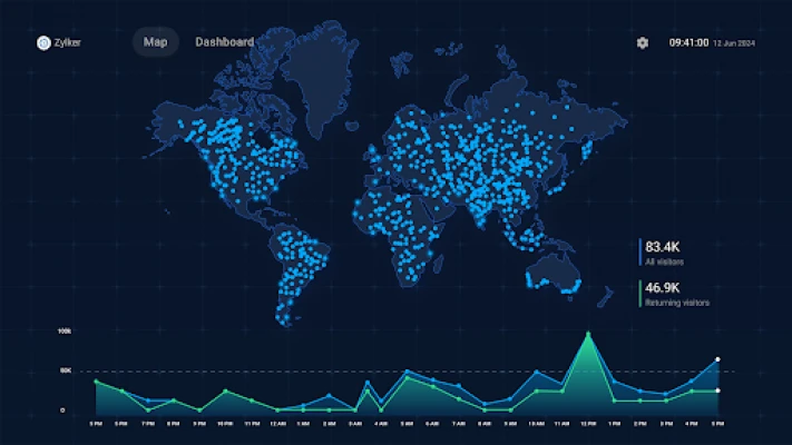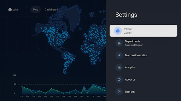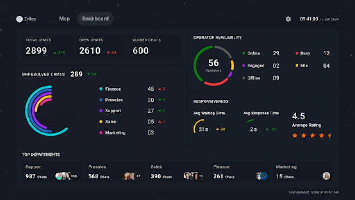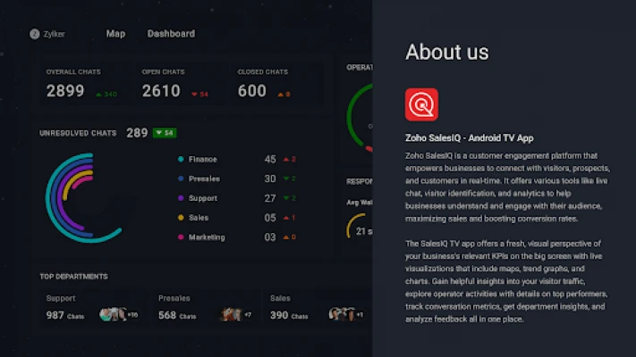The SalesIQ TV app offers a fresh, visual perspective of your business's relevant KPIs on the big screen with live visualizations that include maps, trend graphs, and charts. Gain helpful insights into your visitor traffic, explore operator activities with details on top performers, track conversation metrics, get department insights, and analyze feedback all in one place.